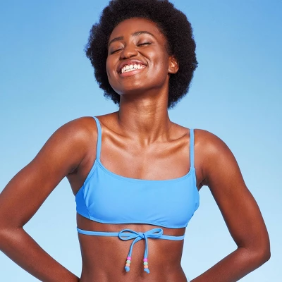 Solid-color bralette bikini top from Wild Fable™. Made of a soft, stretchy fabric with removable cups. Slender shoulder straps with buckles and crisscross back strings that wrap around and knot at the front provide an adjustable fit. Colorful beaded accents on the strings complete the look with a stylish touch.